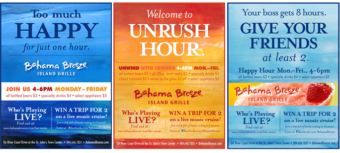 Small-space ads driving traffic to Bahama Breeze's daily Happy Hour.