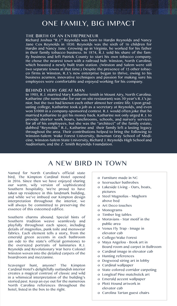 When Kimpton opened a new hotel in Winston-Salem, North Carolina, they didn’t pick just any edifice. They renovated the R.J. Reynolds Building, which was the precursor to the Empire State Building. I edited compiled research for this brochure, adding the Kimpton “voice” to the copy.